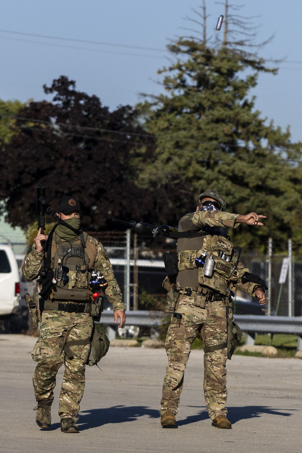 9月26日,在位于好意思国芝加哥西郊布罗德维尤市的外侨与海关规定局职业机构,规定东说念主员向抗议者投掷催泪弹。新华社发(文森特·约翰逊摄)